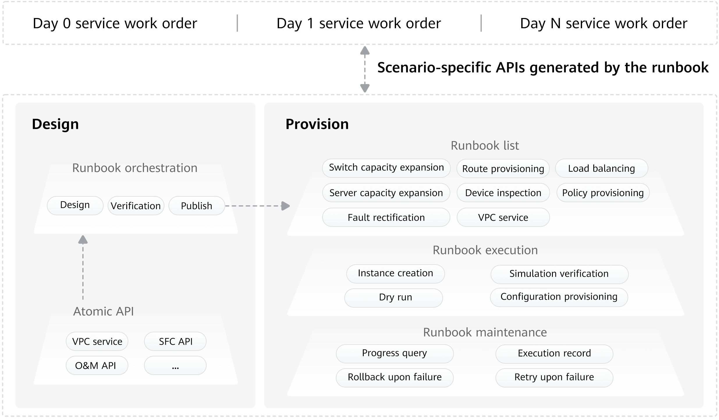 iMaster NCE-Fabric provides northbound open capabilities to design, verify, and release services involved in Day 0, Day 1, and Day N work orders in advance. It interconnects with third-party work order systems to directly invoke scenario-specific APIs generated by the runbook, and supports one-click processing of services such as switch and server capacity expansion in work orders.